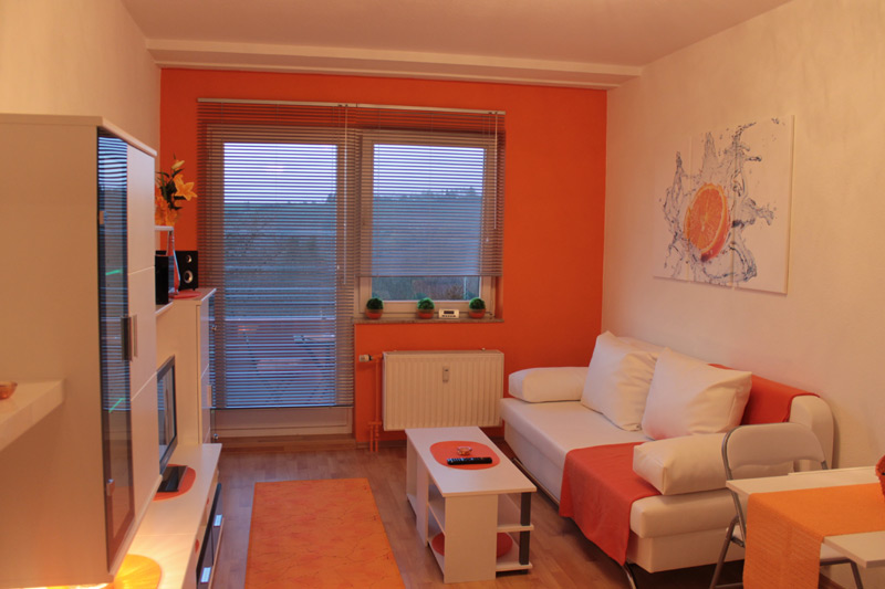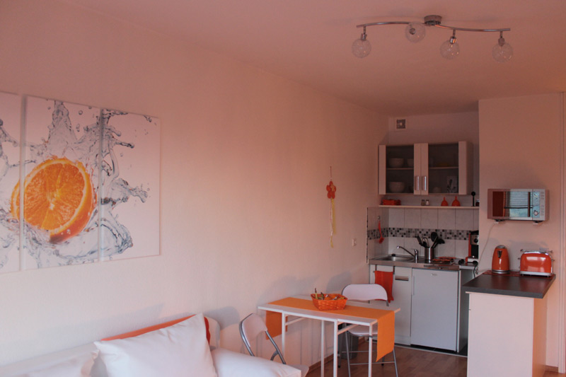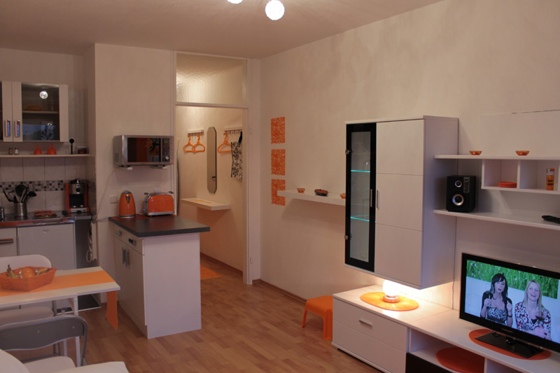 Komplett renoviertes Apartment mit Diele, Badezimmer mit Dusche, großes Wohn-, Ess- und Arbeitszimmer inkl. Küche sowie Schlafcouch.