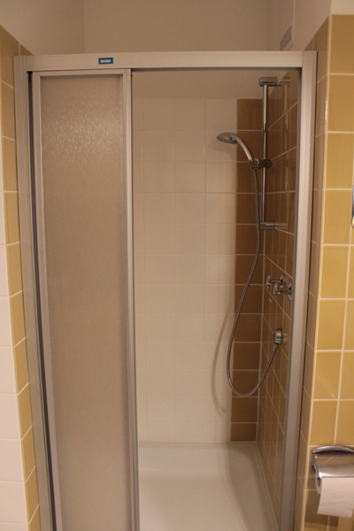- funktionales Badezimmer mit Handtüchern und Fön